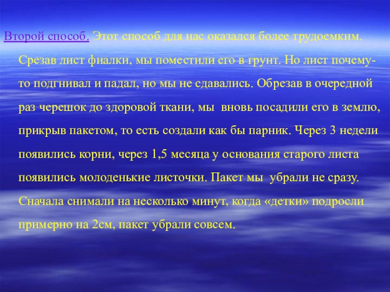 фиалки, мы поместили его в грунт. Но лист почему-то подгнивал и падал, но мы не сдавались. Обрезав в очередной раз черешок до здоровой ткани, мы вновь посадили его в землю, прикрыв пакетом, то есть создали как бы парник. Через 3 недели появились корни, через 1,5 месяца у основания старого листа появились молоденькие листочки. Пакет мы убрали не сразу. Сначала снимали на несколько минут, когда «детки» подросли примерно на 2см, пакет убрали совсем.