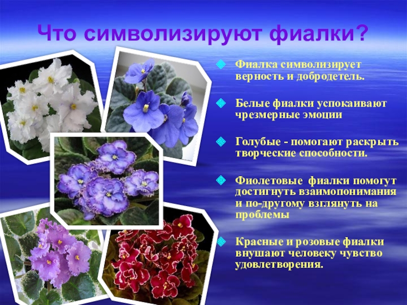 Слайд 20 Белые фиалки успокаивают сильные чувства. Когда человек находится под