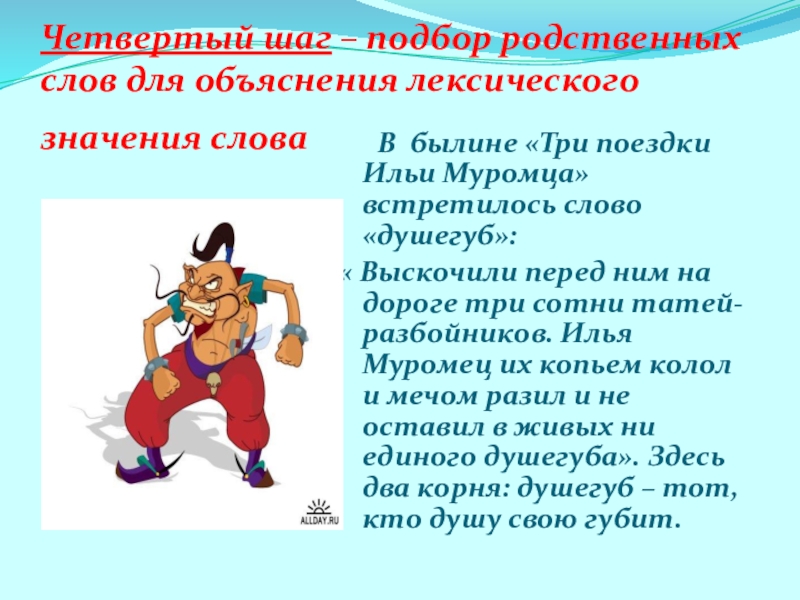 « Выскочили перед ним на дороге три сотни татей-разбойников. Илья Муромец их копьем колол и мечом разил и не оставил в живых ни единого душегуба». Здесь два корня: душегуб – тот, кто душу свою губит.