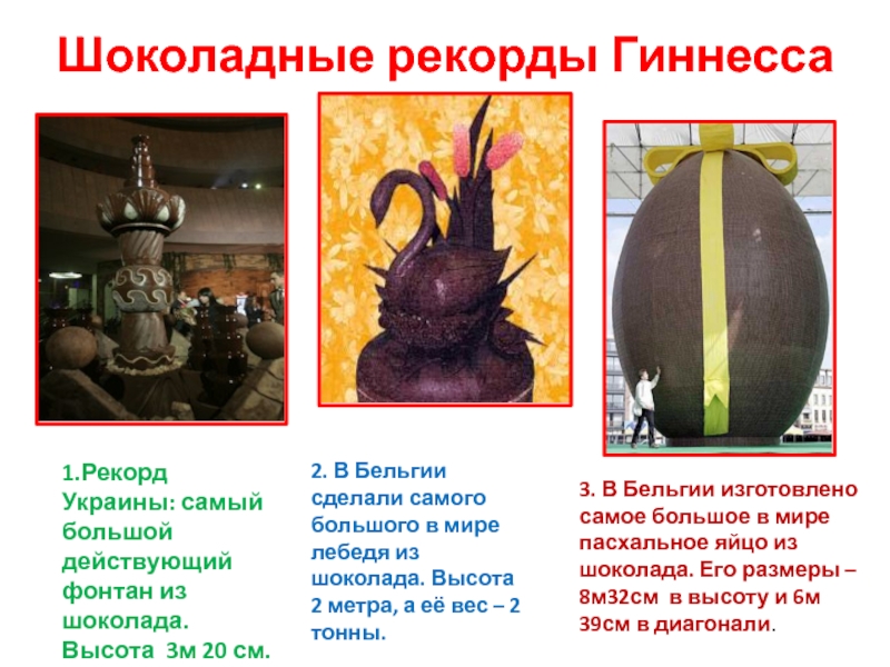 2. В Бельгии сделали самого большого в мире лебедя из шоколада. Высота 2 метра, а её вес – 2 тонны.