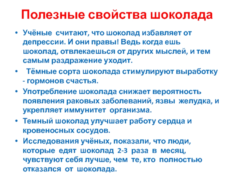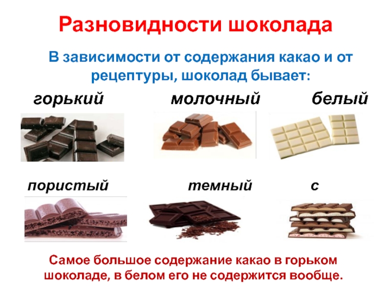 Самое большое содержание какао в горьком шоколаде, в белом его не содержится вообще.