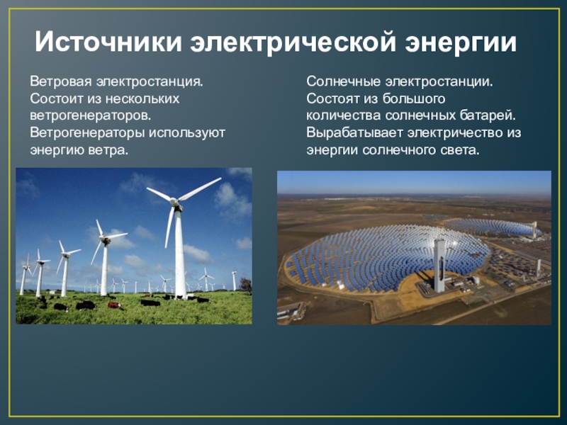 Солнечные электростанции. Состоят из большого количества солнечных батарей. Вырабатывает электричество из энергии солнечного света.