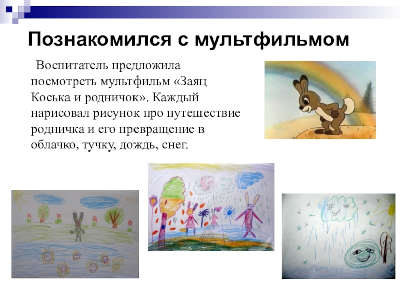 Воспитатель предложила посмотреть мультфильм «Заяц Коська и родничок». Каждый