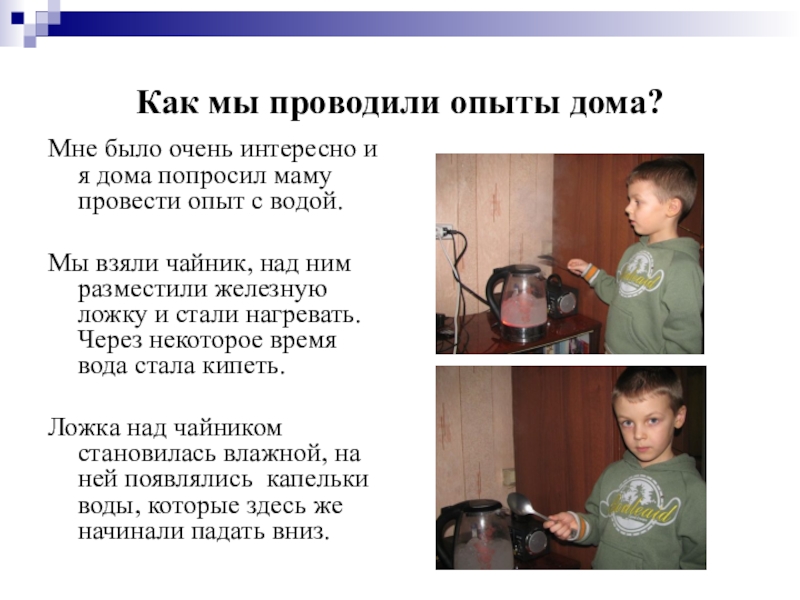 Ложка над чайником становилась влажной, на ней появлялись капельки воды, которые здесь же начинали падать вниз.