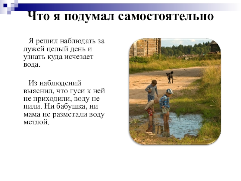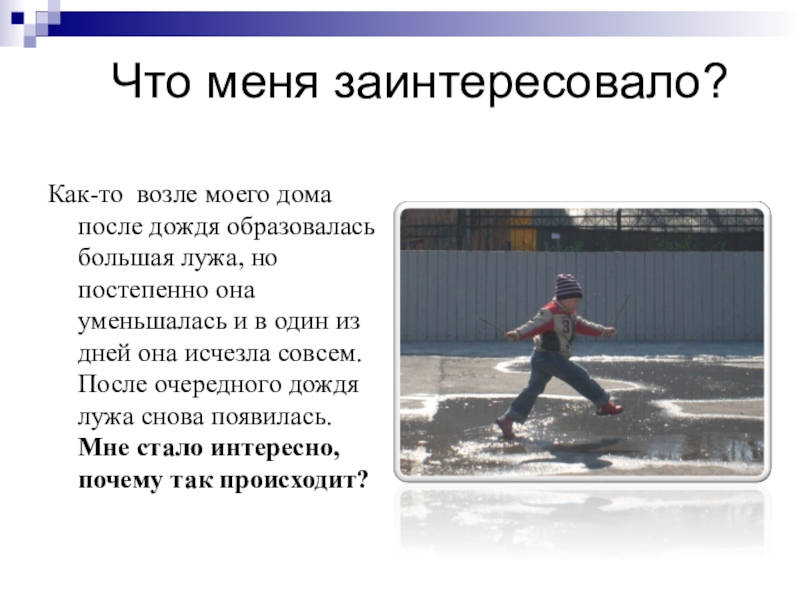 но постепенно она уменьшалась и в один из дней она исчезла совсем. После очередного дождя лужа снова появилась. Мне стало интересно, почему так происходит?