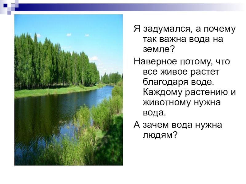 Слайд 20Я задумался, а почему так важна вода на земле?