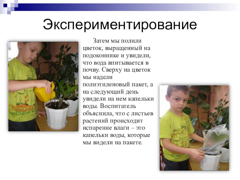 увидели, что вода впитывается в почву. Сверху на цветок мы надели полиэтиленовый пакет, а на следующий день увидели на нем капельки воды. Воспитатель объяснила, что с листьев растений происходит испарение влаги – это капельки воды, которые мы видели на пакете.