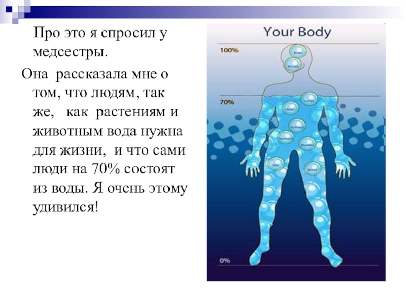 о том, что людям, так же, как растениям и животным вода нужна для жизни, и что сами люди на 70% состоят из воды. Я очень этому удивился!