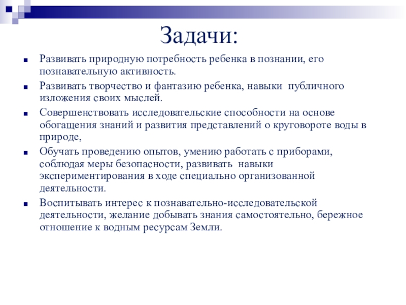 Совершенствовать исследовательские способности на основе обогащения знаний и развития представлений о круговороте воды в природе,