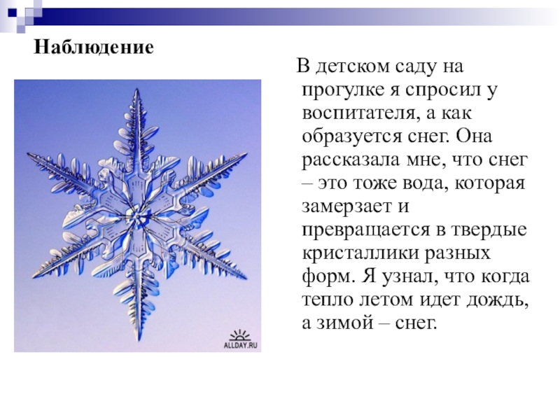 а как образуется снег. Она рассказала мне, что снег – это тоже вода, которая замерзает и превращается в твердые кристаллики разных форм. Я узнал, что когда тепло летом идет дождь, а зимой – снег.