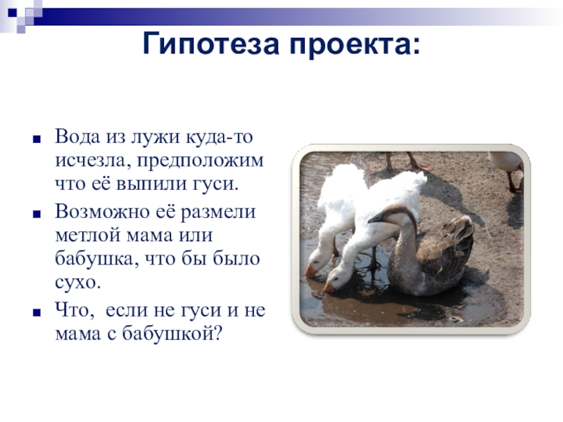 Из наблюдений выяснил, что гуси к ней не приходили, воду не пили. Ни бабушка, ни мама не разметали воду метлой.