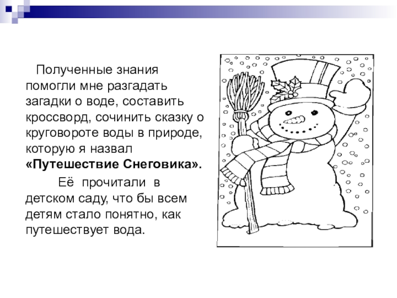 воде, составить кроссворд, сочинить сказку о круговороте воды в природе, которую я назвал «Путешествие Снеговика».