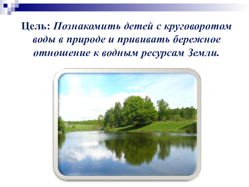 Слайд 2Цель: Познакомить детей с круговоротом воды в природе и прививать бережное