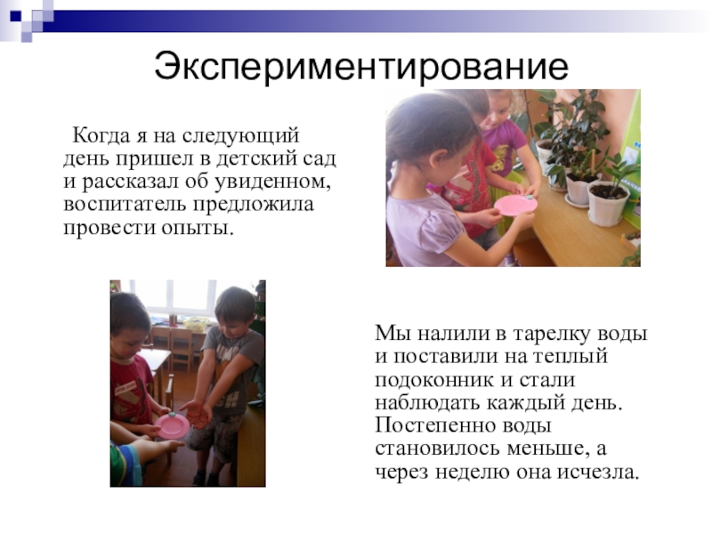 Мы налили в тарелку воды и поставили на теплый подоконник и стали наблюдать каждый день. Постепенно воды становилось меньше, а через неделю она исчезла.