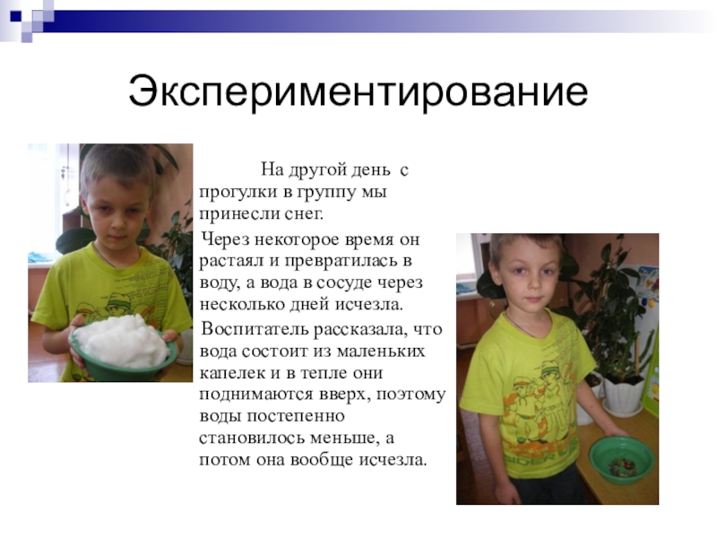 сад и рассказал об увиденном, воспитатель предложила провести опыты.