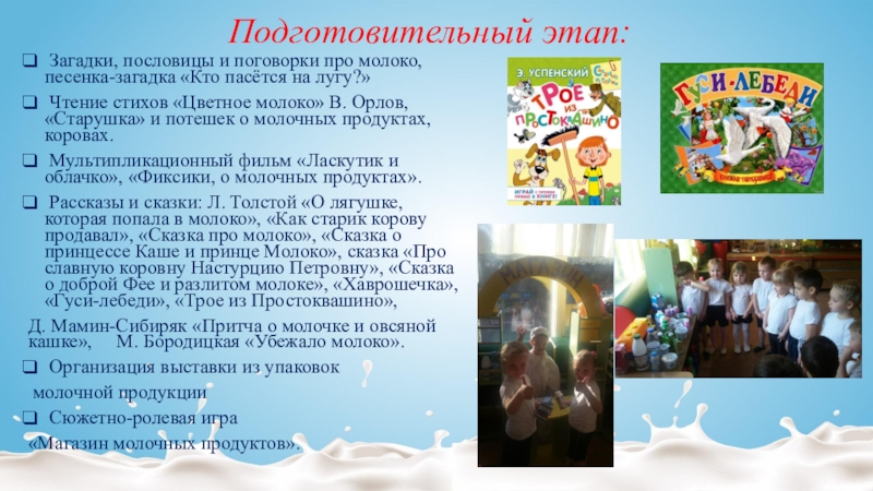 Рассказы и сказки: Л. Толстой «О лягушке, которая попала в молоко», «Как старик корову продавал», «Сказка про молоко», «Сказка о принцессе Каше и принце Молоко», сказка «Про славную коровну Настурцию Петровну», «Сказка о доброй Фее и разлитом молоке», «Хаврошечка», «Гуси-лебеди», «Трое из Простоквашино»,