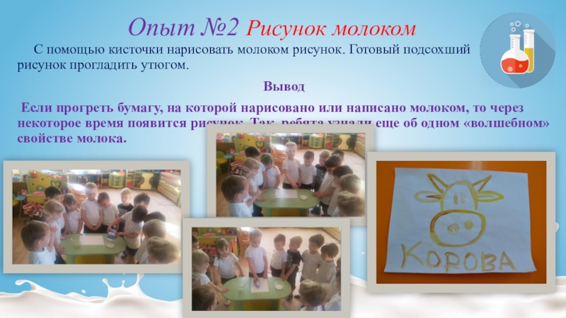 Если прогреть бумагу, на которой нарисовано или написано молоком, то через некоторое время появится рисунок. Так, ребята узнали еще об одном «волшебном» свойстве молока.