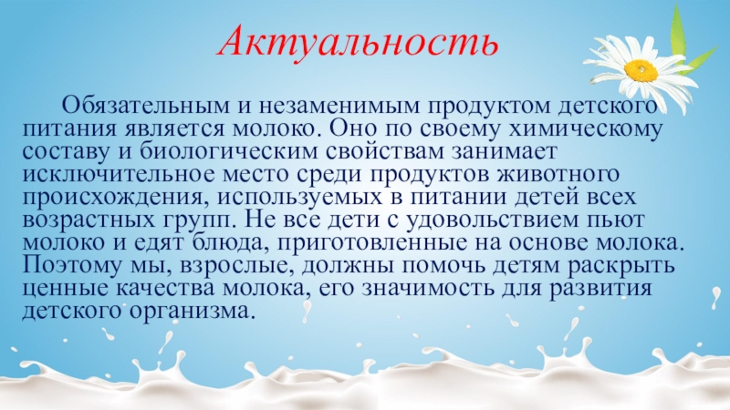 молоко. Оно по своему химическому составу и биологическим свойствам занимает исключительное место среди продуктов животного происхождения, используемых в питании детей всех возрастных групп. Не все дети с удовольствием пьют молоко и едят блюда, приготовленные на основе молока. Поэтому мы, взрослые, должны помочь детям раскрыть ценные качества молока, его значимость для развития детского организма.