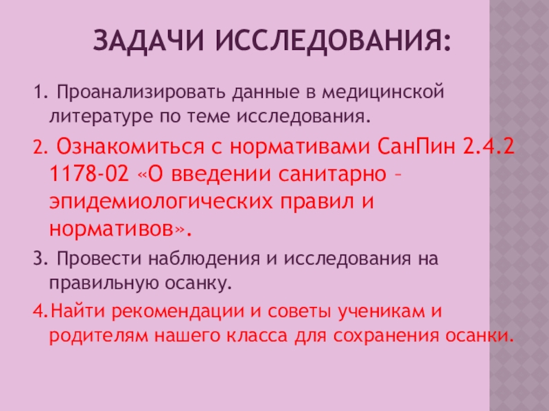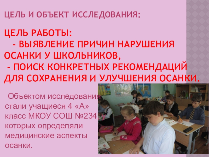 Объектом исследования стали учащиеся 4 «А» класс МКОУ СОШ №234, у которых определяли медицинские аспекты осанки.