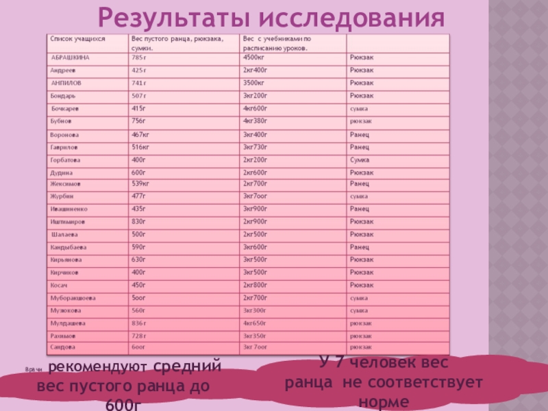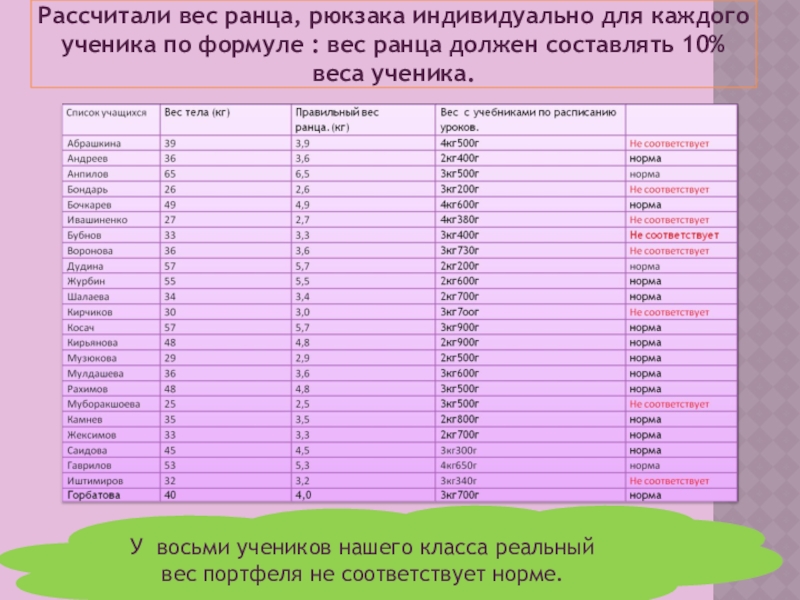 У восьми учеников нашего класса реальный вес портфеля не соответствует норме.