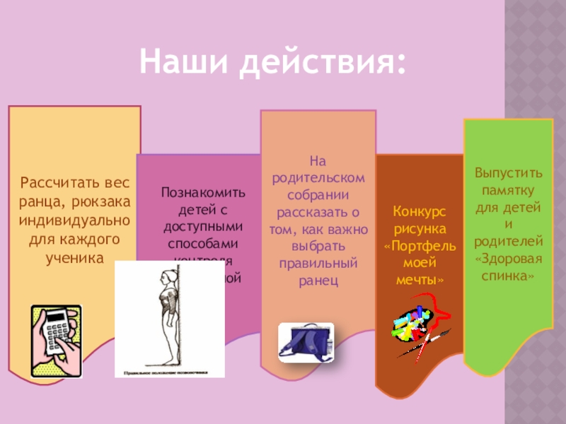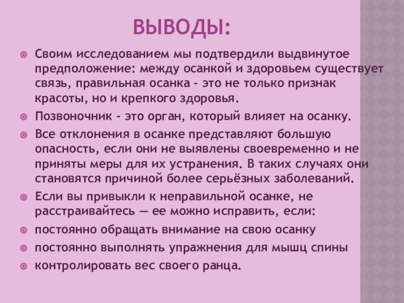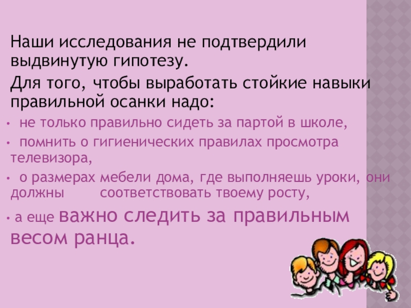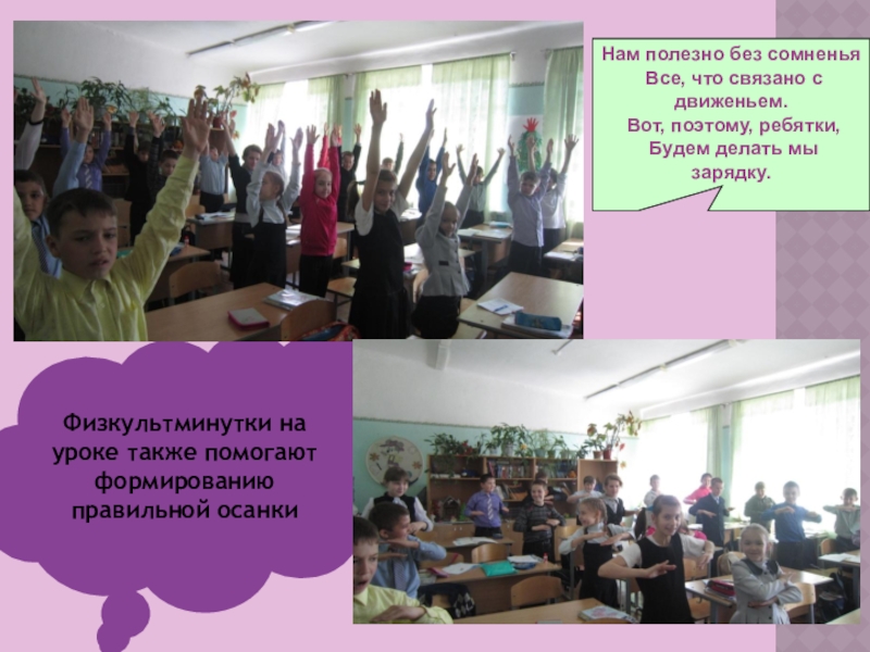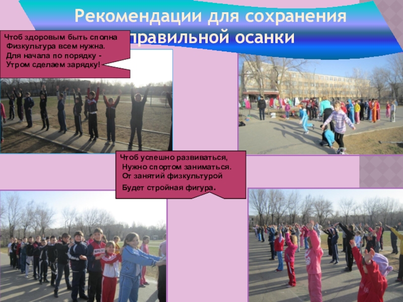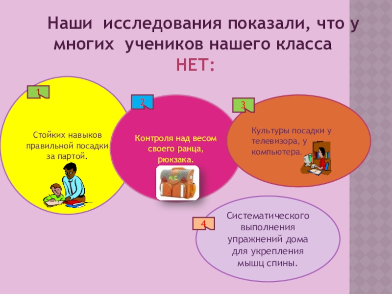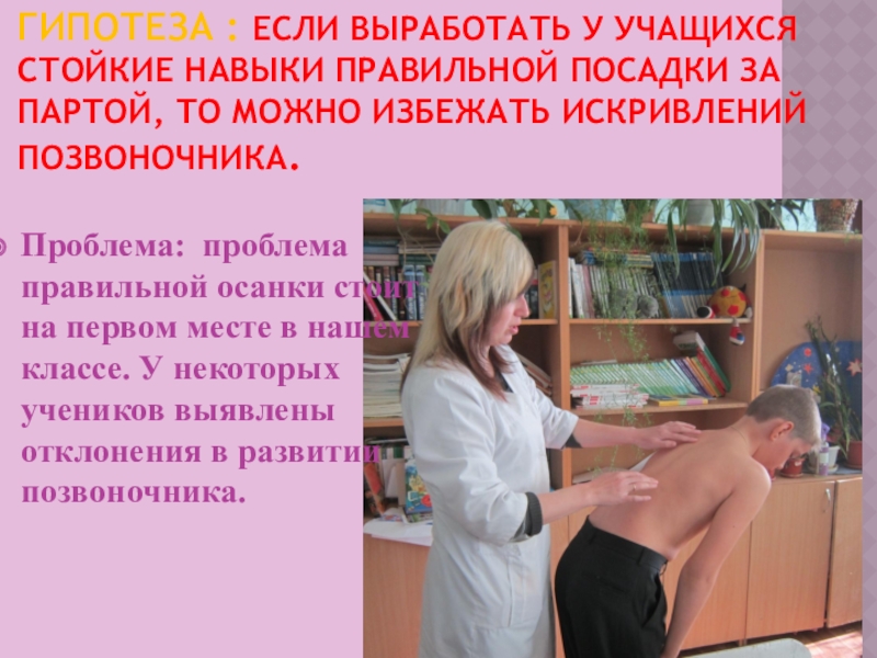 Проблема: проблема правильной осанки стоит на первом месте в нашем классе. У некоторых учеников выявлены отклонения в развитии позвоночника.