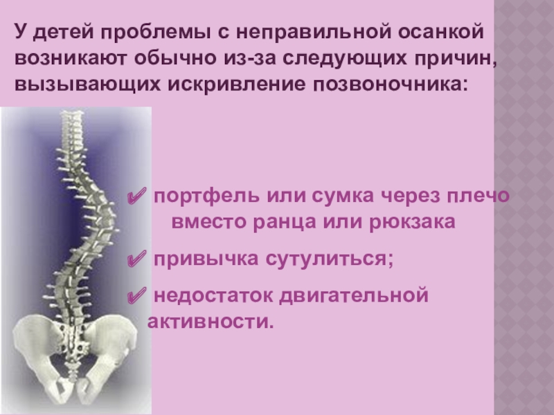 У детей проблемы с неправильной осанкой возникают обычно из-за следующих причин, вызывающих искривление позвоночника: