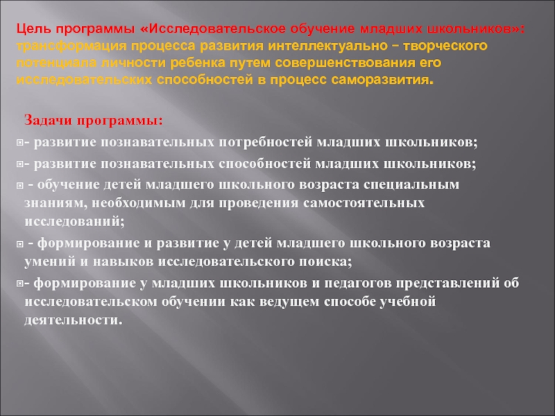 - формирование и развитие у детей младшего школьного возраста умений и навыков исследовательского поиска;