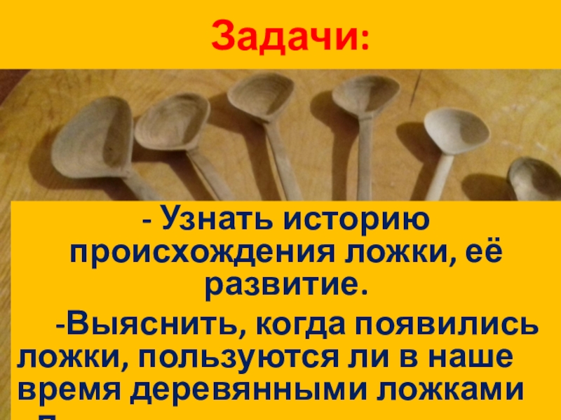 Задачи: - Узнать историю происхождения ложки, её развитие.   -Выяснить, когда появились ложки, пользуются ли в
