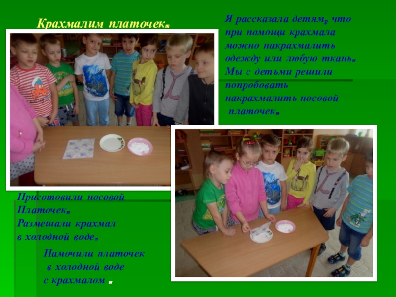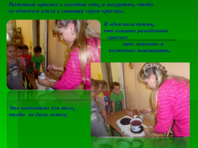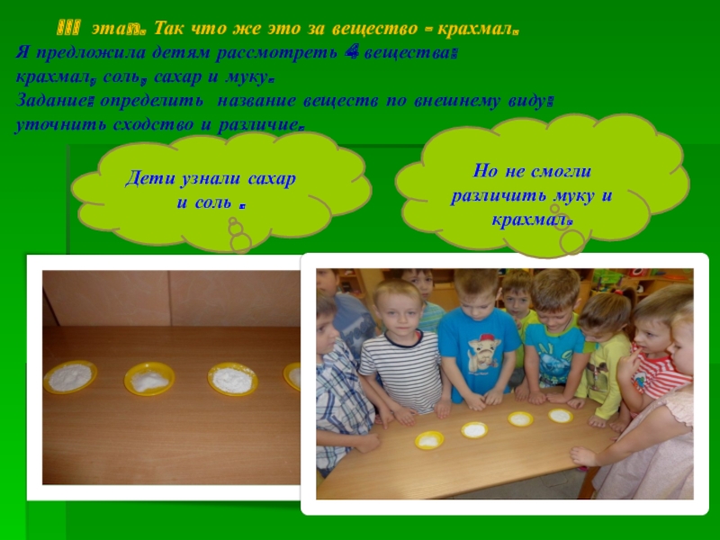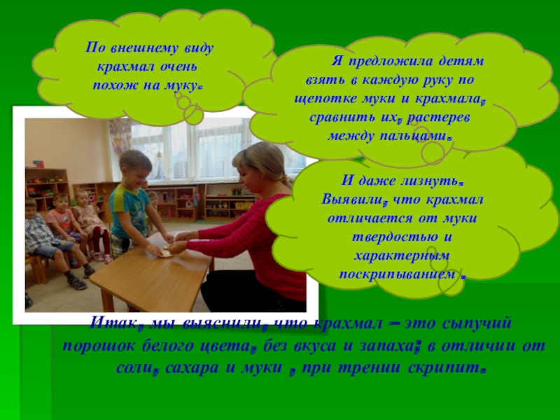 Я предложила детям взять в каждую руку по щепотке муки и крахмала, сравнить их, растерев между пальцами.