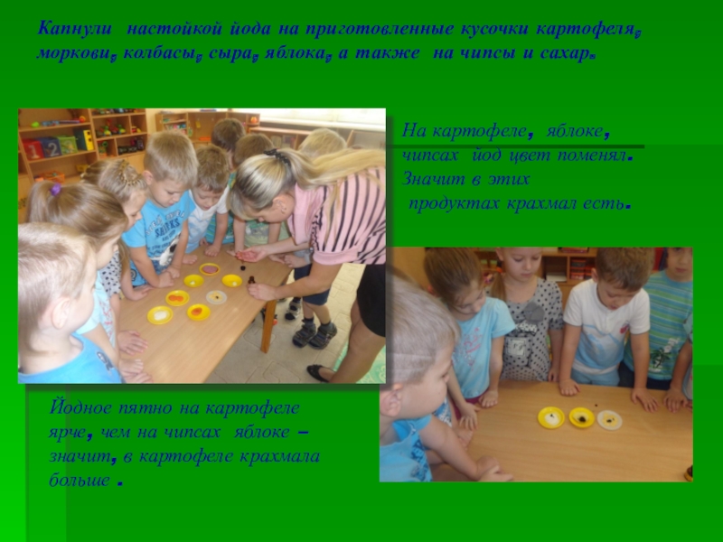 Йодное пятно на картофеле ярче, чем на чипсах яблоке – значит, в картофеле крахмала больше .