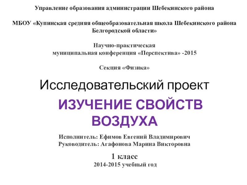 Выполняя работу, я сам много узнал о воздухе, создал презентацию «Изучение свойств воздуха», смог провести опыты, показать их одноклассникам и заинтересовать их.