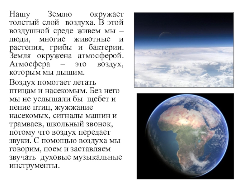 мы – люди, многие животные и растения, грибы и бактерии. Земля окружена атмосферой. Атмосфера – это воздух, которым мы дышим.