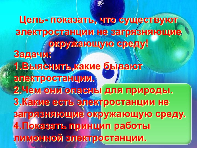 Слайд 5Цель- показать, что существуют электростанции не загрязняющие окружающую среду!