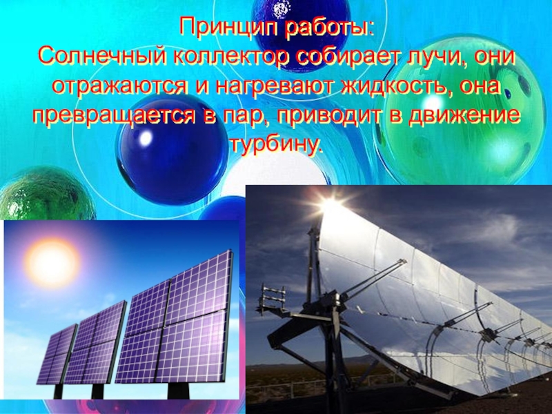 Слайд 9Принцип работы: Солнечный коллектор собирает лучи, они отражаются и нагревают жидкость, она