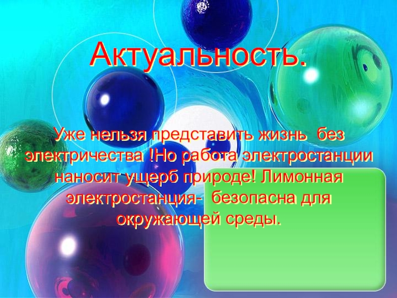 Актуальность. Уже нельзя представить жизнь без электричества !Но работа электростанции наносит ущерб природе! Лимонная электростанция- безопасна для окружающей среды.