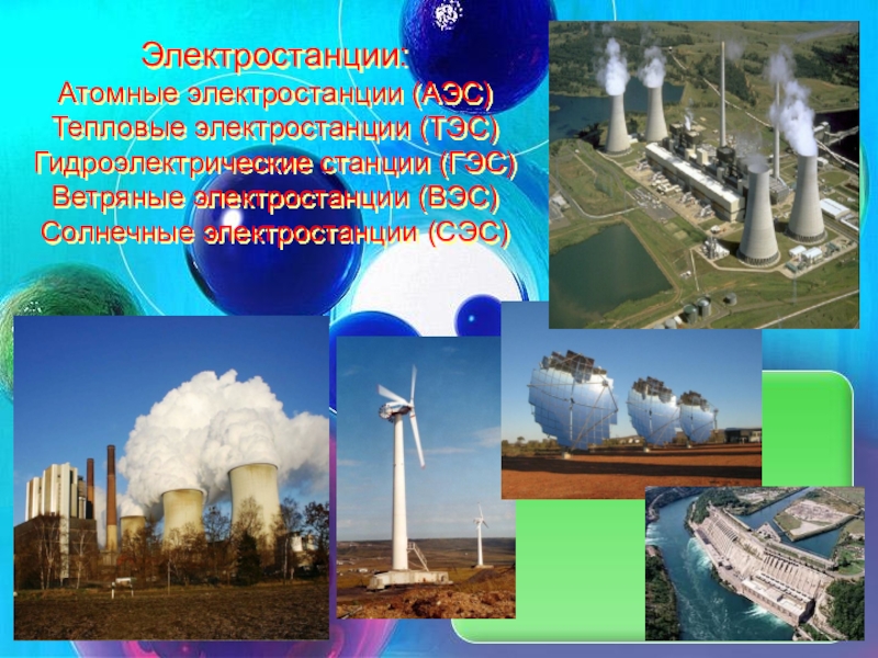 Электростанции: Атомные электростанции (АЭС)  Тепловые электростанции (ТЭС)  Гидроэлектрические станции (ГЭС) Ветряные электростанции (ВЭС) Солнечные электростанции