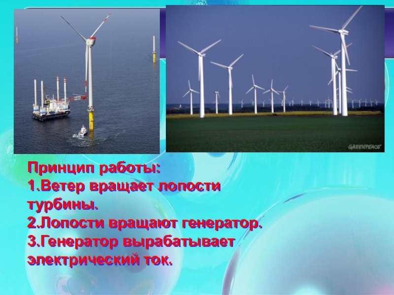 Слайд 7Принцип работы: 1.Ветер вращает лопости турбины. 2.Лопости вращают генератор. 3.Генератор вырабатывает электрический ток.