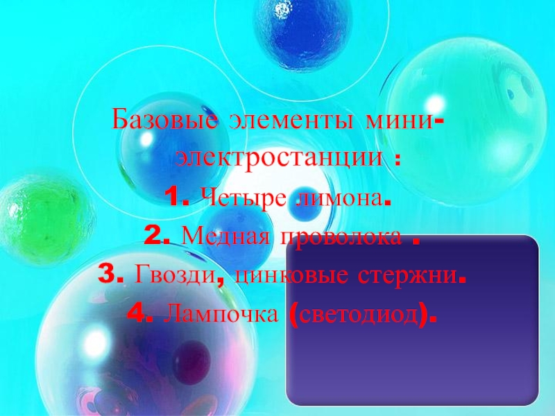 Базовые элементы мини-электростанции :1. Четыре лимона. 2. Медная проволока . 3. Гвозди, цинковые стержни. 4. Лампочка (светодиод).