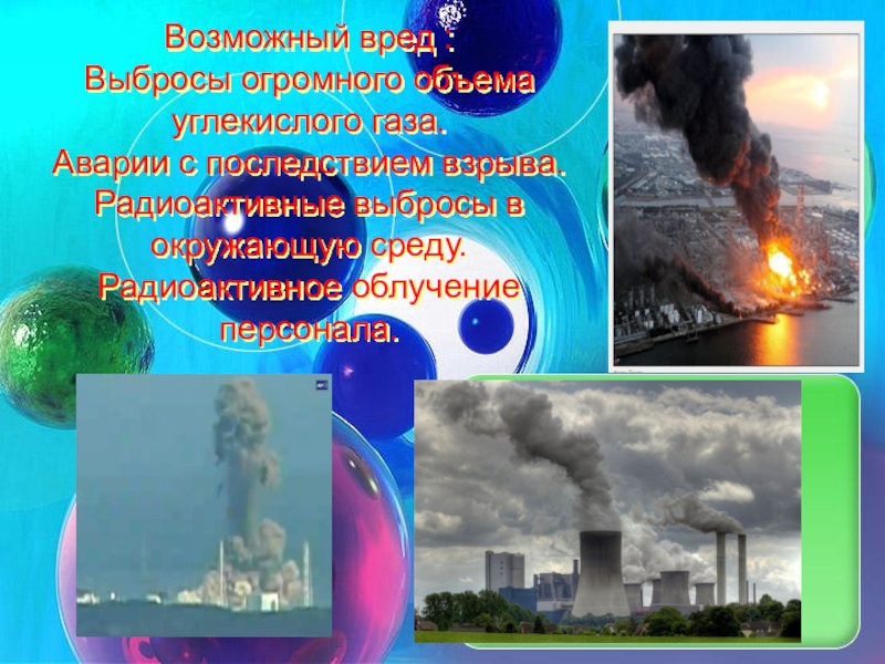 Слайд 4Возможный вред : Выбросы огромного объема углекислого газа. Аварии с последствием взрыва. Радиоактивные