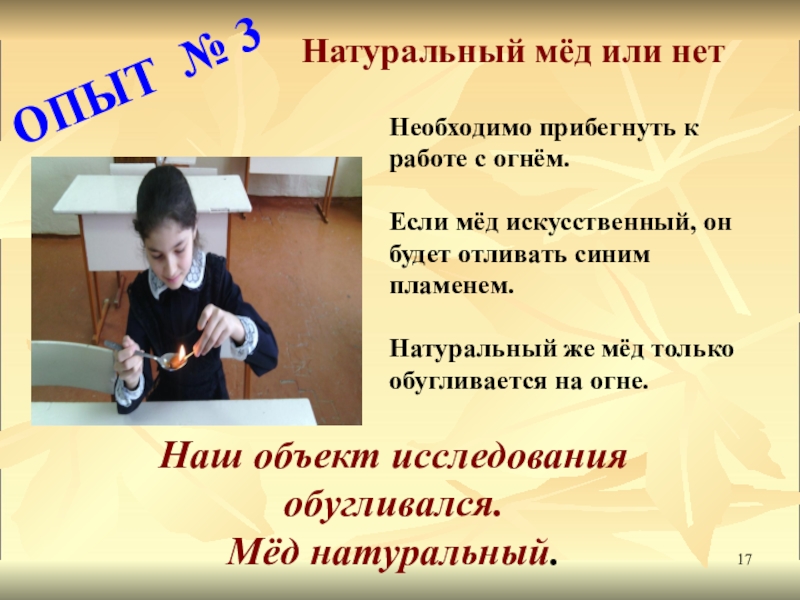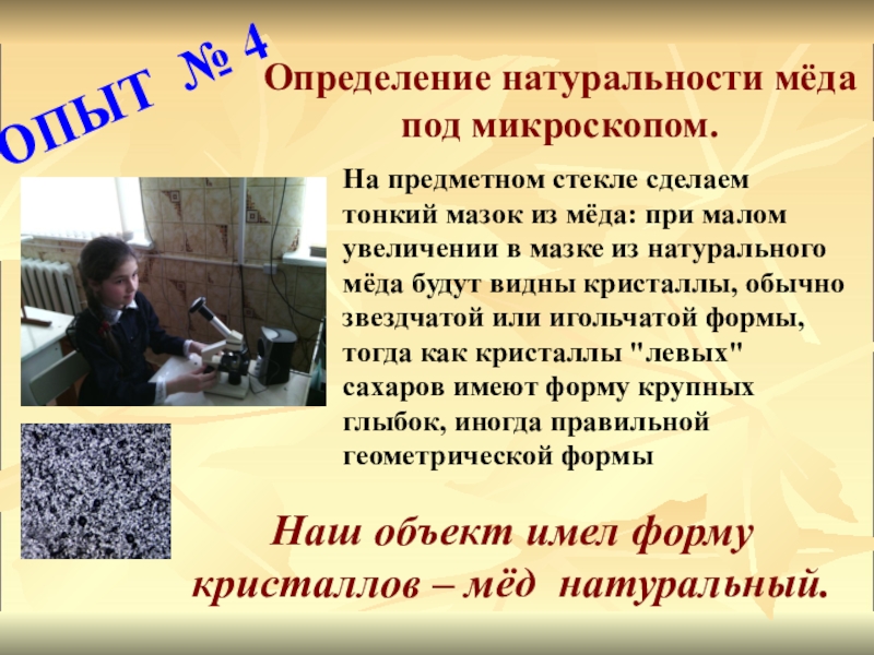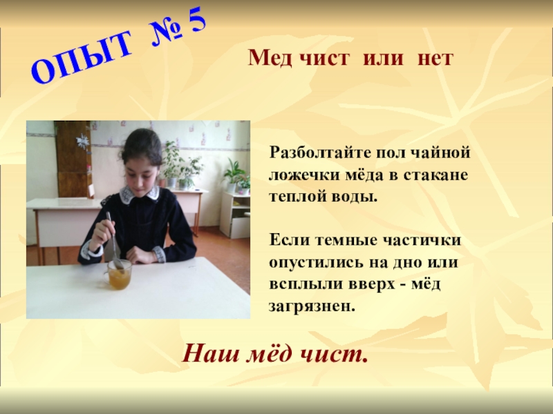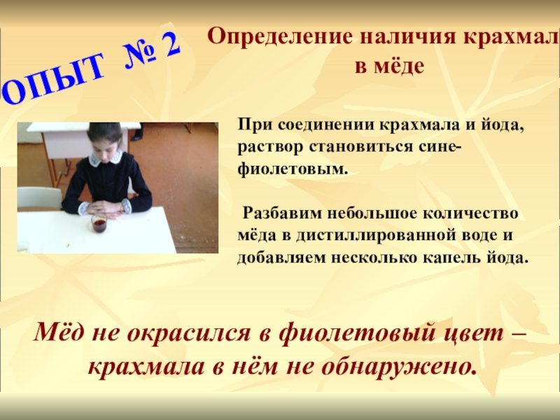 На 10г мёда используем одну чайную ложку уксуса, чтобы определить наличие мела.
