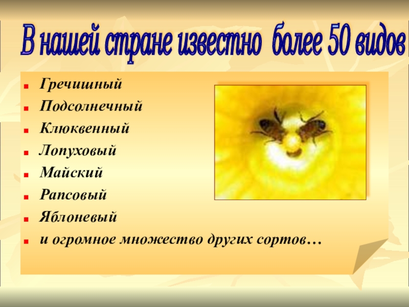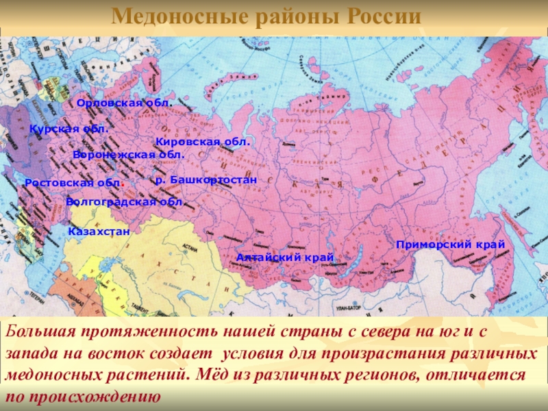 Большая протяженность нашей страны с севера на юг и с запада на восток создает условия для произрастания различных медоносных растений. Мёд из различных регионов, отличается по происхождению