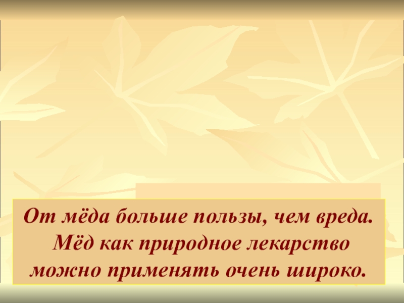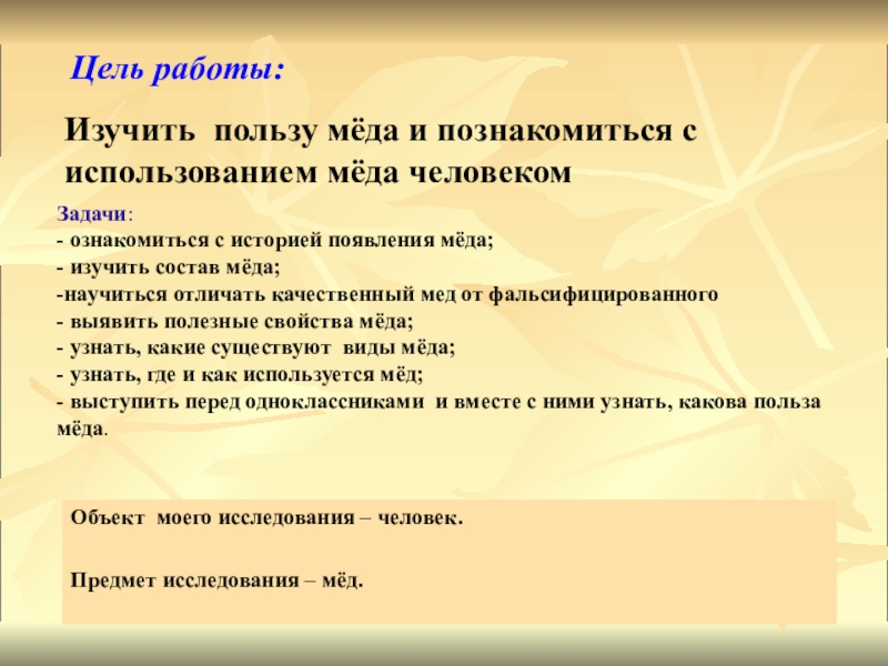 - выступить перед одноклассниками и вместе с ними узнать, какова польза мёда.