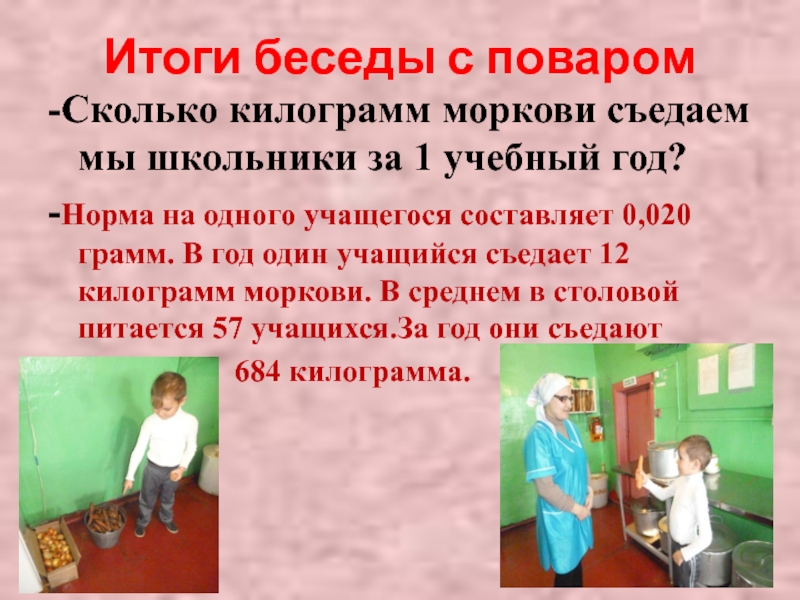 -Норма на одного учащегося составляет 0,020грамм. В год один учащийся съедает 12 килограмм моркови. В среднем в столовой питается 57 учащихся.За год они съедают