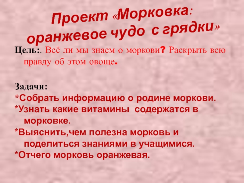 *Выяснить,чем полезна морковь и поделиться знаниями в учащимися.