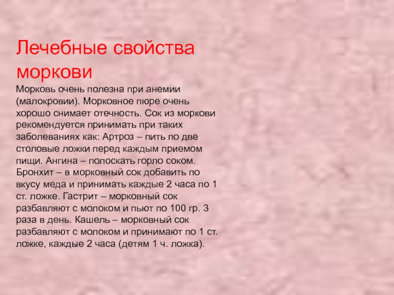 очень хорошо снимает отечность. Сок из моркови рекомендуется принимать при таких заболеваниях как: Артроз – пить по две столовые ложки перед каждым приемом пищи. Ангина – полоскать горло соком. Бронхит – в морковный сок добавить по вкусу меда и принимать каждые 2 часа по 1 ст. ложке. Гастрит – морковный сок разбавляют с молоком и пьют по 100 гр. 3 раза в день. Кашель – морковный сок разбавляют с молоком и принимают по 1 ст. ложке, каждые 2 часа (детям 1 ч. ложка).