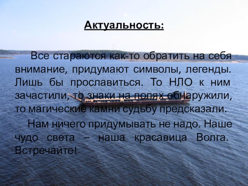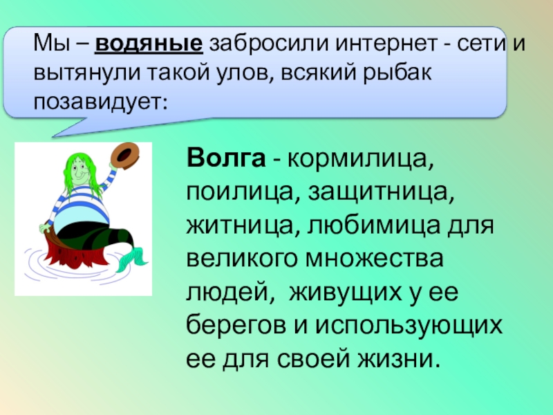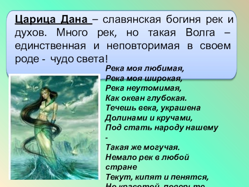 Волга - кормилица, поилица, защитница, житница, любимица для великого множества людей, живущих у ее берегов и использующих ее для своей жизни.