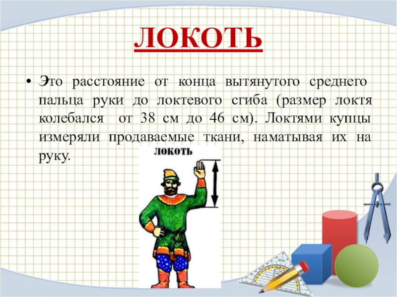 (размер локтя колебался от 38 см до 46 см). Локтями купцы измеряли продаваемые ткани, наматывая их на руку.
