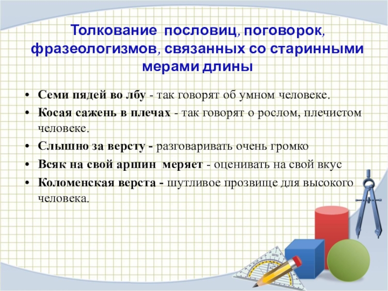 Слайд 31Толкование пословиц, поговорок, фразеологизмов, связанных со старинными мерами длины