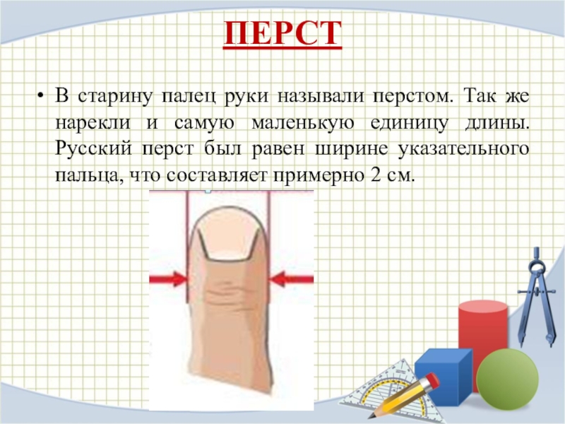 маленькую единицу длины. Русский перст был равен ширине указательного пальца, что составляет примерно 2 см.