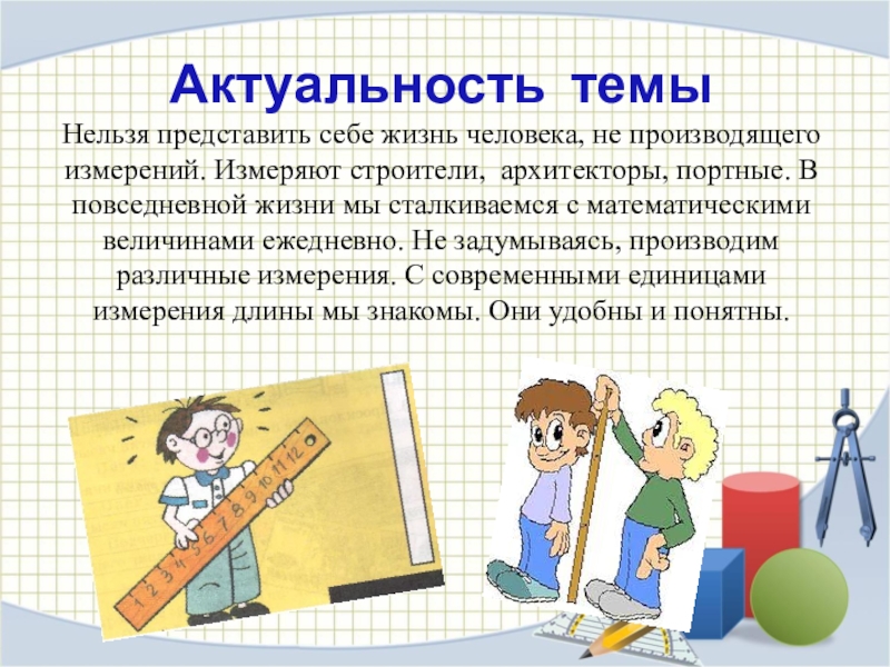 строители, архитекторы, портные. В повседневной жизни мы сталкиваемся с математическими величинами ежедневно. Не задумываясь, производим различные измерения. С современными единицами измерения длины мы знакомы. Они удобны и понятны.